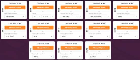 | Color | Sort by mana type of the card (White, Black, Red, Multi-color, Colorless, etc.) Important: Multi-colored cards will be sorted into either the "Multi-color" bin or a single-color bin matching mana found in their casting cost, whichever bin the card reaches first. Multi-color bins should be placed before single-color bins in the sorting order (i.e., lower bin numbers). |