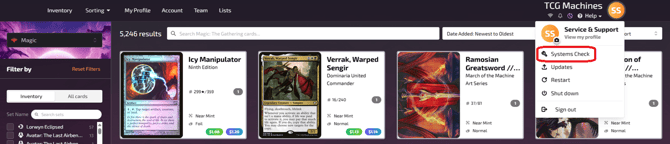 First, navigate to the top-right corner of the sort UI page. From here, click on the circle account, the Systems Check will be at the top of the list: