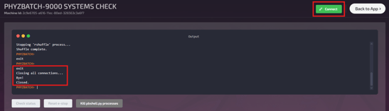 - Disconnect - the PhyzBatch-9000 Systems Check page takes hold of the camera in the scanner bay to perform many of the page's functions. As such you will need to click on the red "Disconnect" button at the top of the page and wait for it to transform into the green "Connect" button before clicking "Back to App" and returning to the sort page.